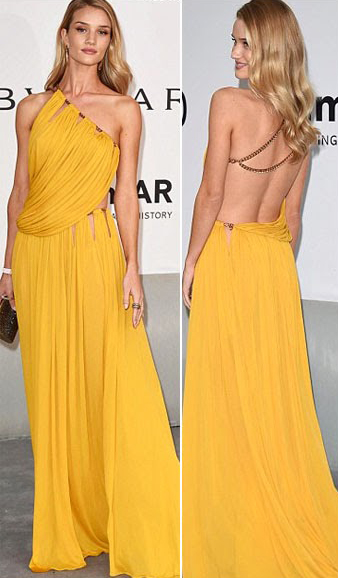 Rosie Huntington-Whiteley looking gorgeous in a grecian style yellow dress during the Cannes Film Festival 2014.
